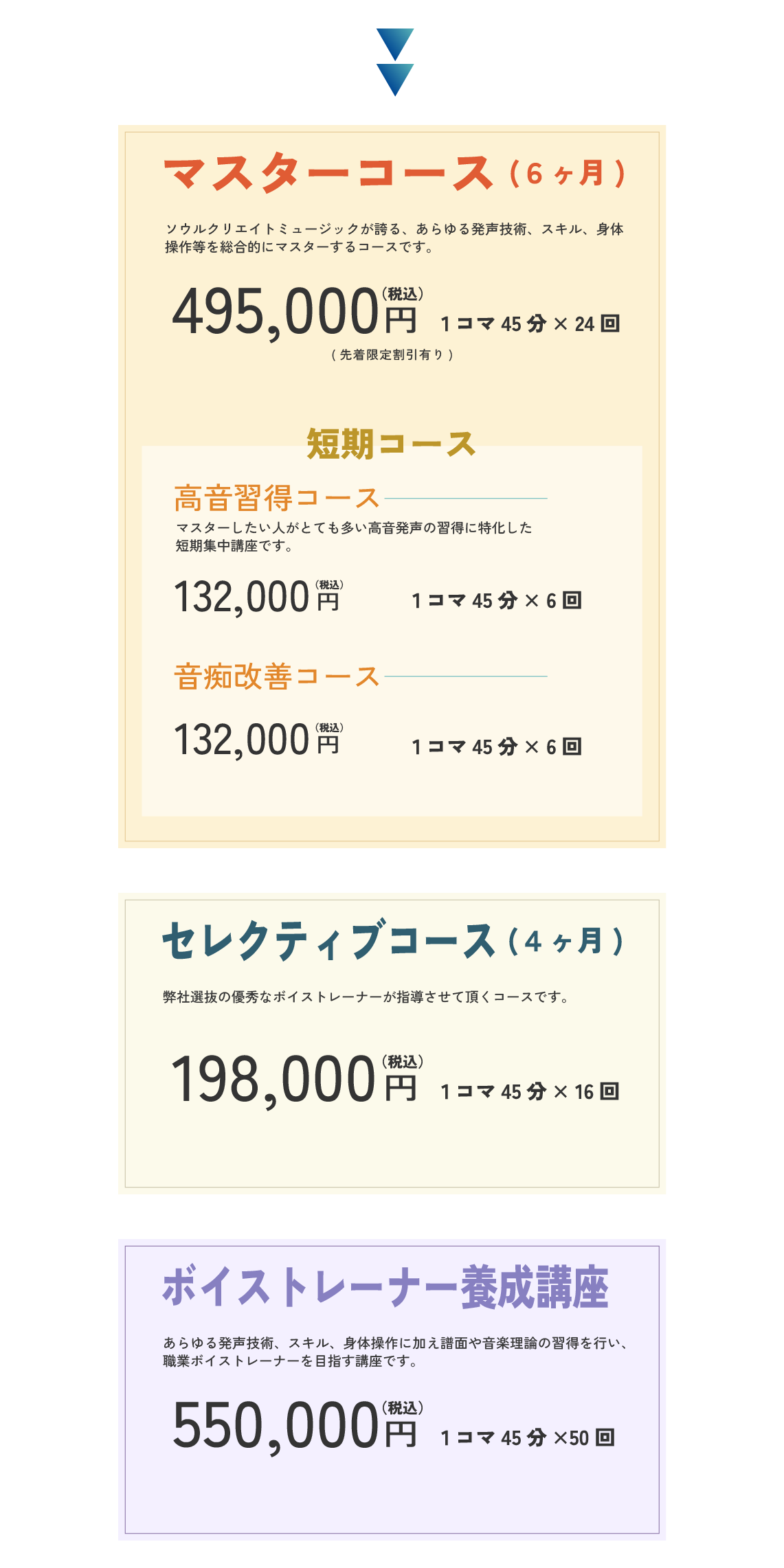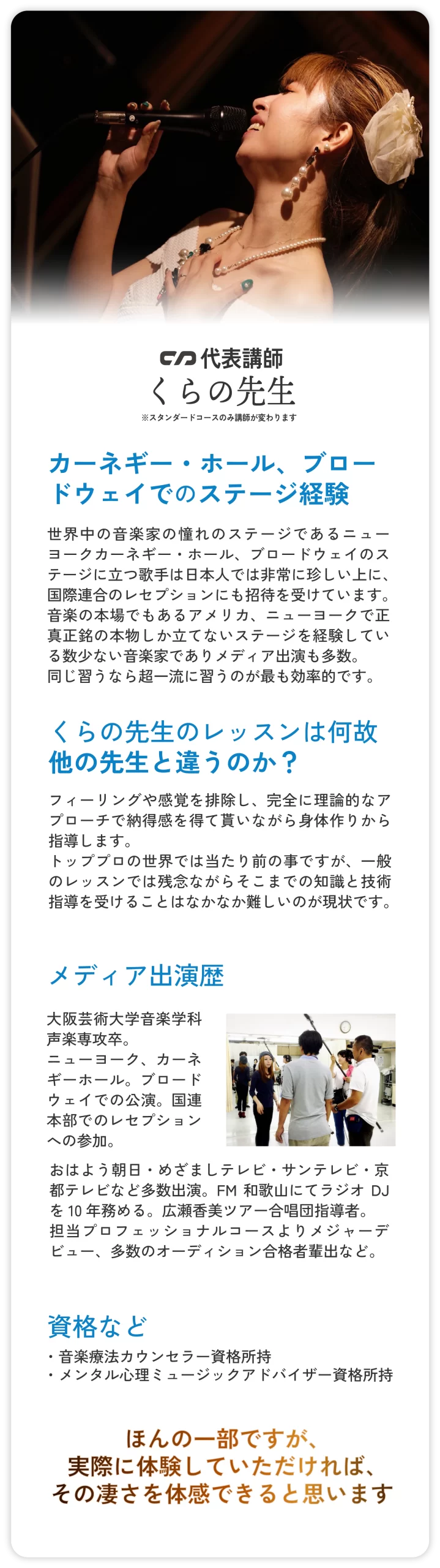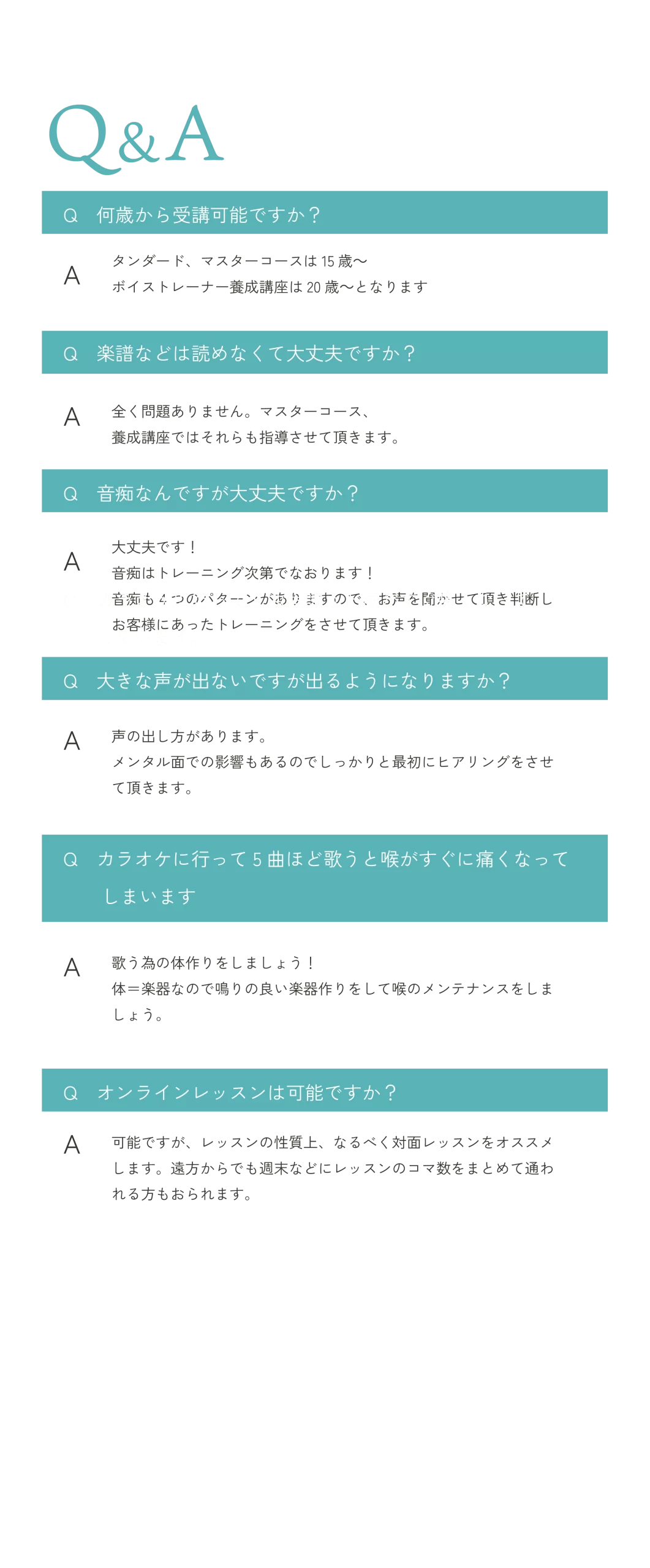 良い声が出るフォームは人それぞれ違うので1 人1 人カウンセリングを行いながら正しい発声が出来る姿勢、骨盤の位置を変えます。喉や声帯の動き、声を出すのに基本的な身体の使い方を指導。