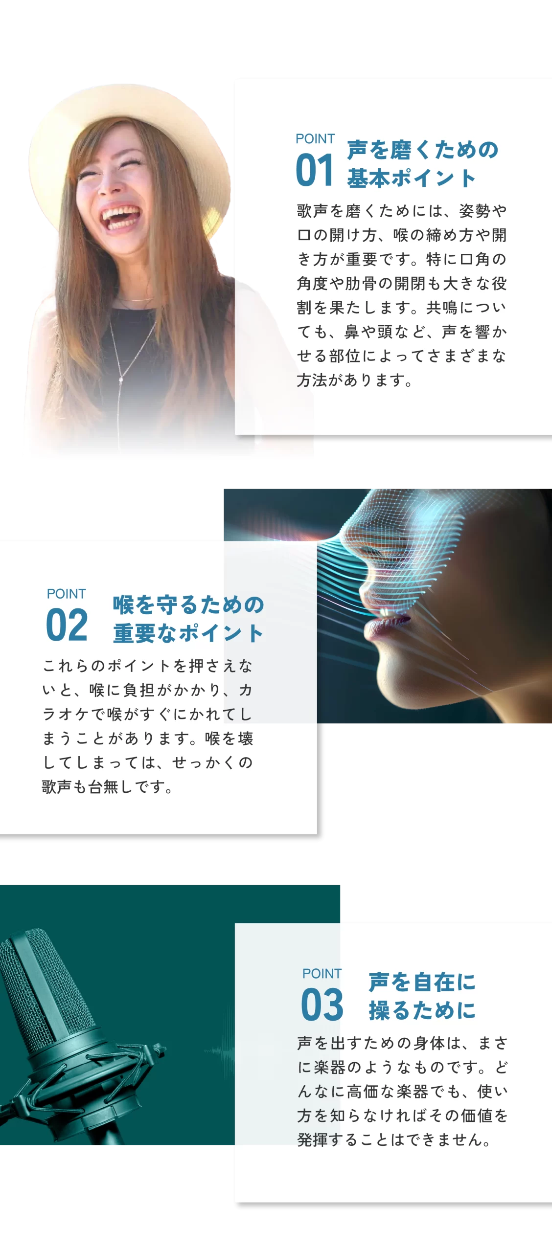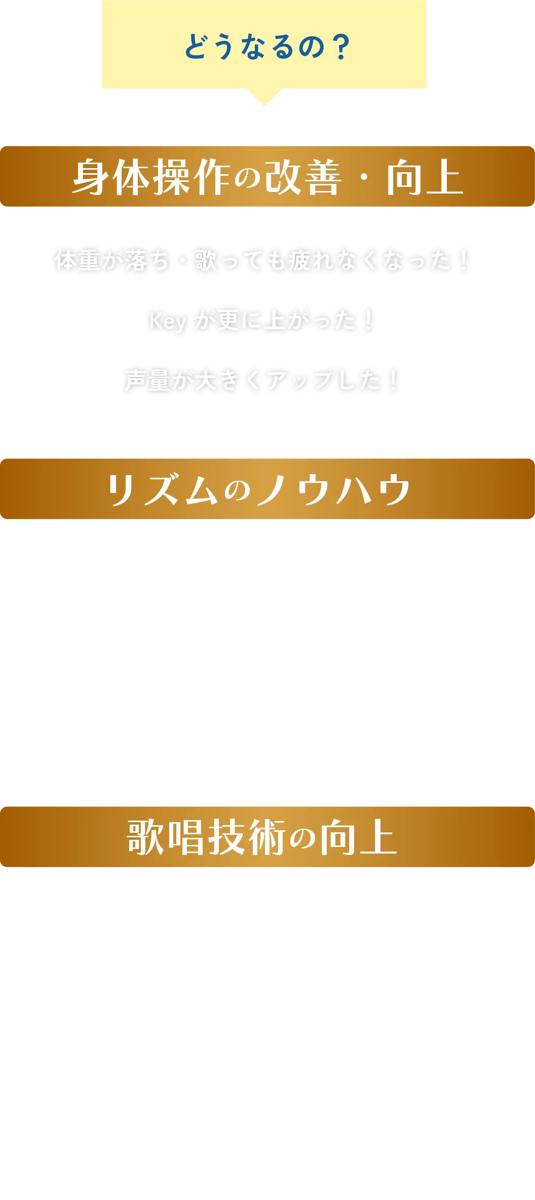 発声、歌唱に必要な筋肉にアプローチをかける。主にインナーマッスル、背筋、腹斜筋のトレーニング。どんな声を出したいかにより付ける筋肉は異なります。